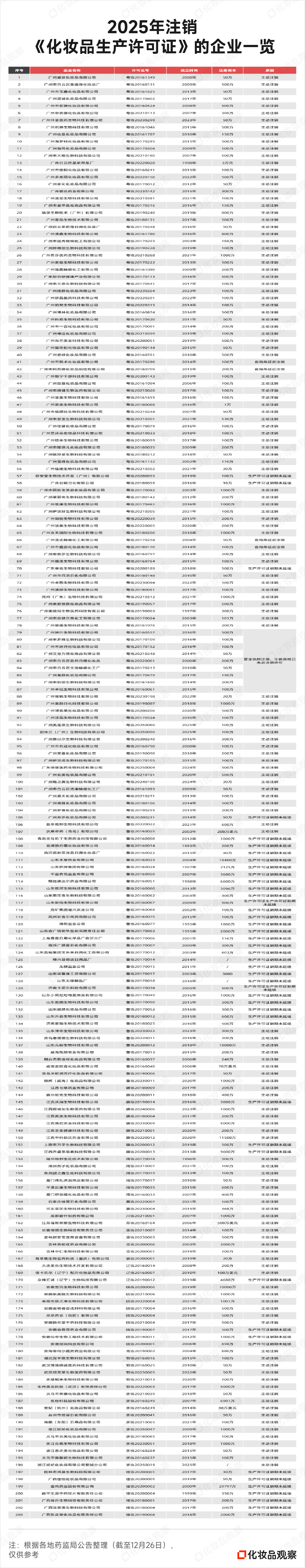 《化妆品观察》梳理各地监管部门公告发现,2025年,全国范围内至少有203家企业注销了《化妆品生产许可证》。