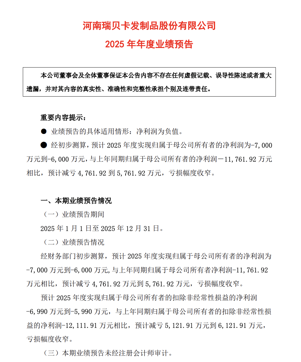 根据公司公告,经财务部门初步测算,瑞贝卡预计2025年归母净利润为-7000万元到-6000万元,与上年同期的-1.18亿元相比,预计减亏4761.92万元到5761.92万元,亏损幅度收窄。